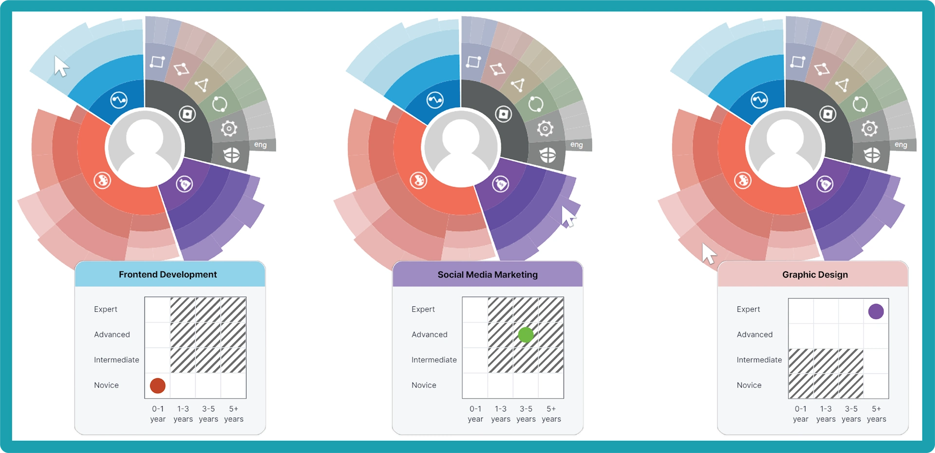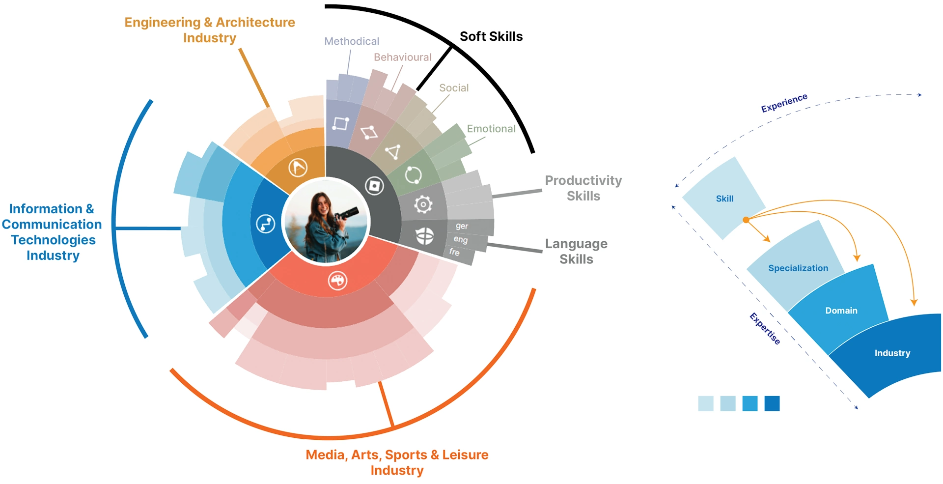 Counting from the top of the chart clockwise, you would get to see the representation of soft skills, productivity skills and language skills. The angles of the chart circles representing these skill groups are fixed in size. The linear depths however vary based on competency levels per each skill group.