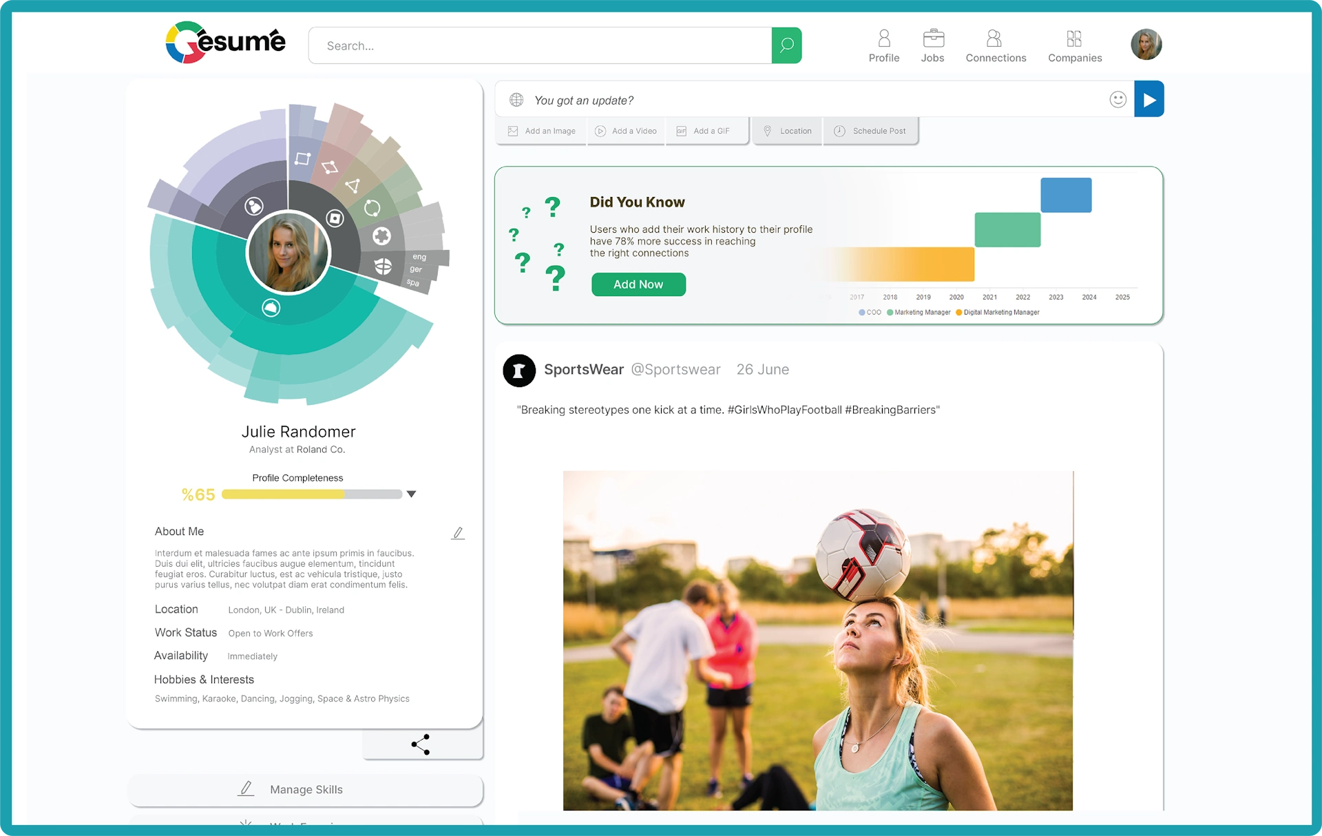 Gésumé offers an interactive survey to help determine the soft skills of an individual user. The results, expressed in categorized qualifications, then get plotted on the individual’s professional profile.