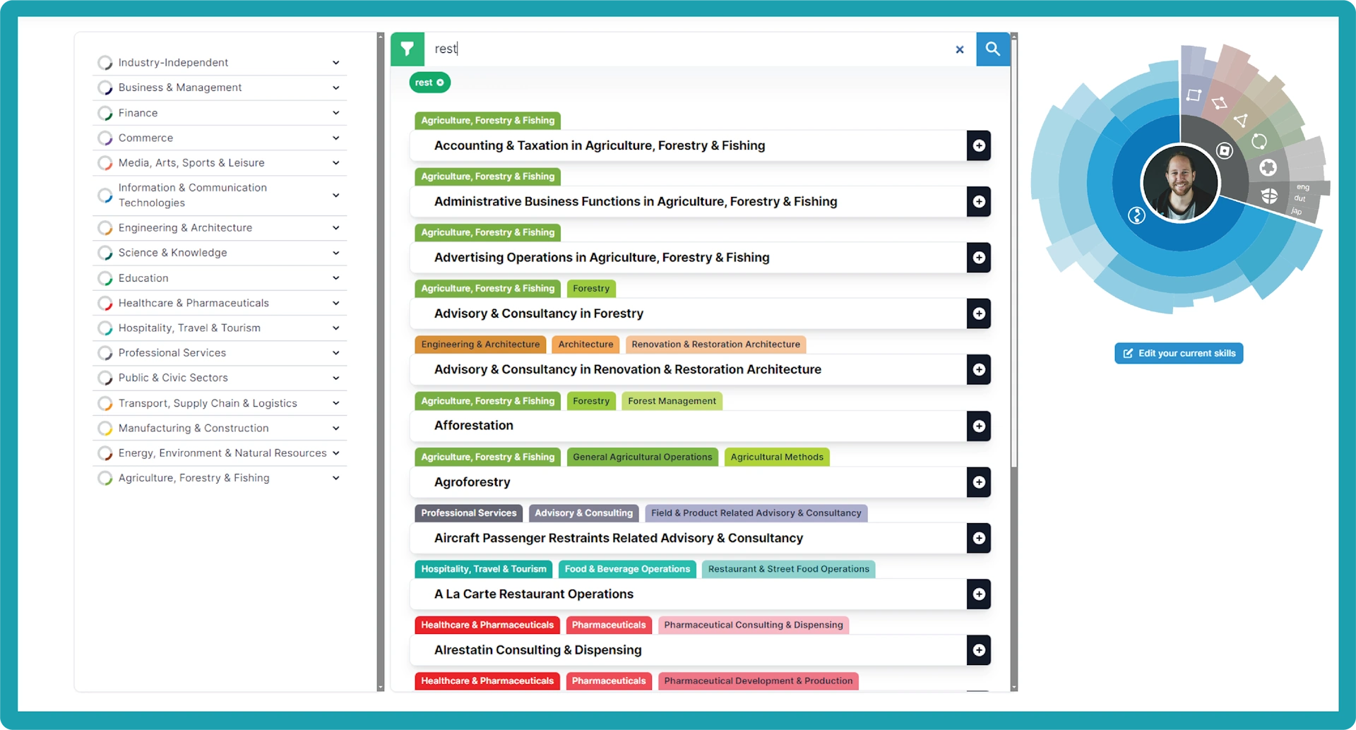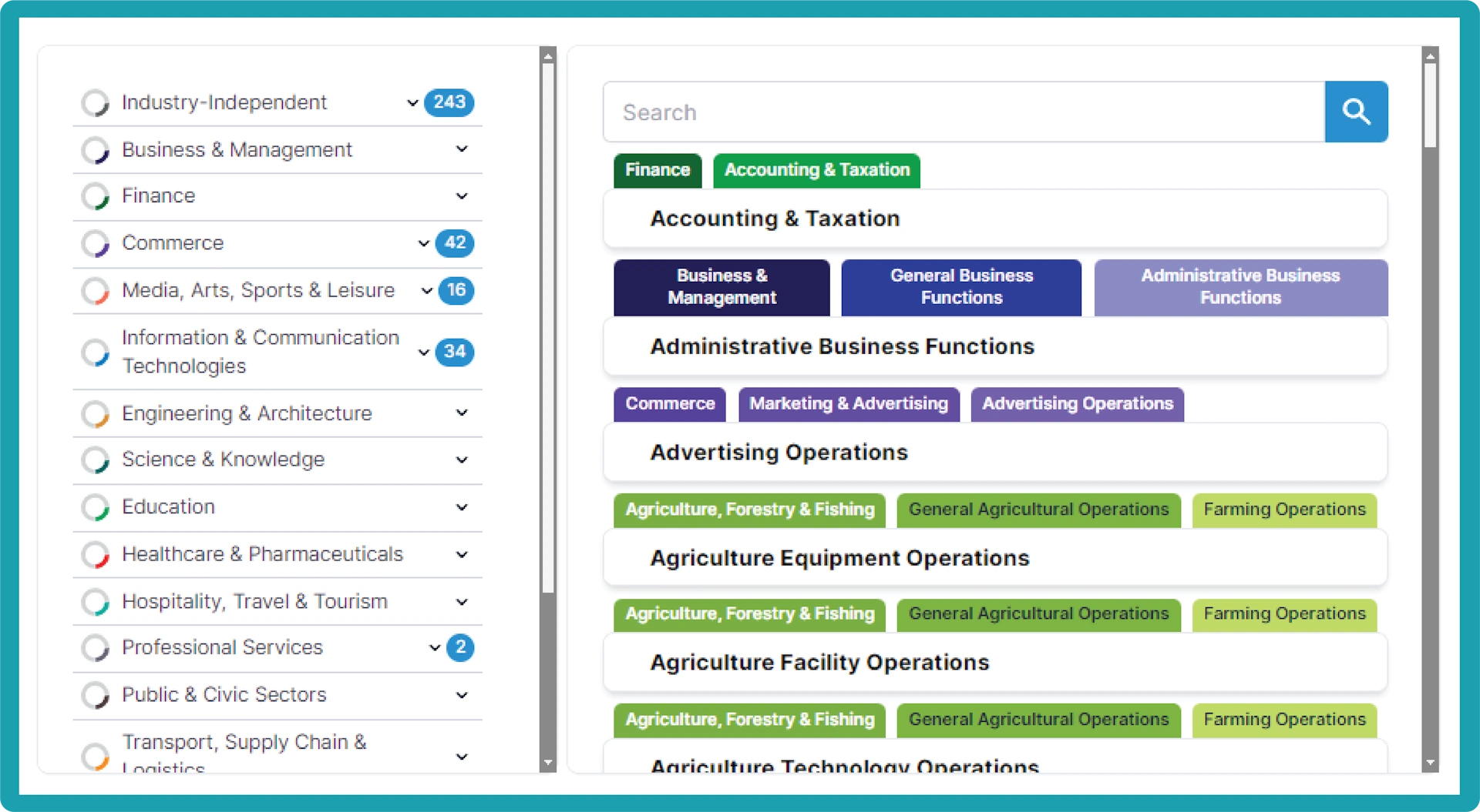 Industry skills are sector-specific skills that are laid out over a hierarchic split of fields under each industry as domains and specializations. Most industry skills take two parameters to define levels: Level of Expertise and Level of Experience.